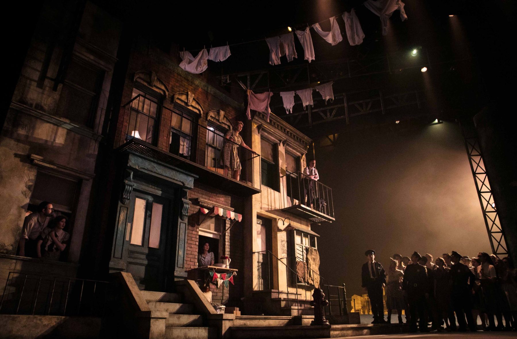 We set the cramped tenement buildings on an angle, and to give more of a sense of claustrophobia had a rail track bridge immediately above. The downstage buildings made of quite traditional wood and canvas, the Midtown Manhattan landscape built of metal and plastic to give a contrasting feel to the two worlds which were so close together.