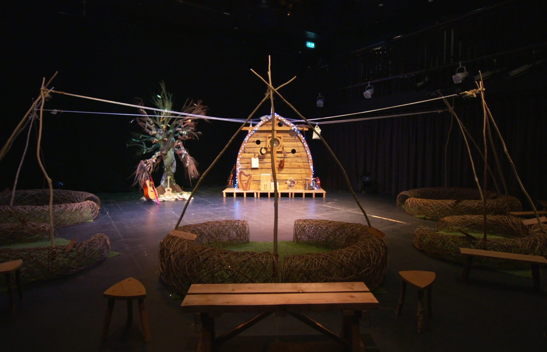 The audience entered a magical theatre environment, featuring giant willow nests and handcrafted stools as seating. The bird house was developed in collaboration with craftsman Ben Thomas for the original show and a large tree, scattered with embroidered leaves, was a sculptural addition.