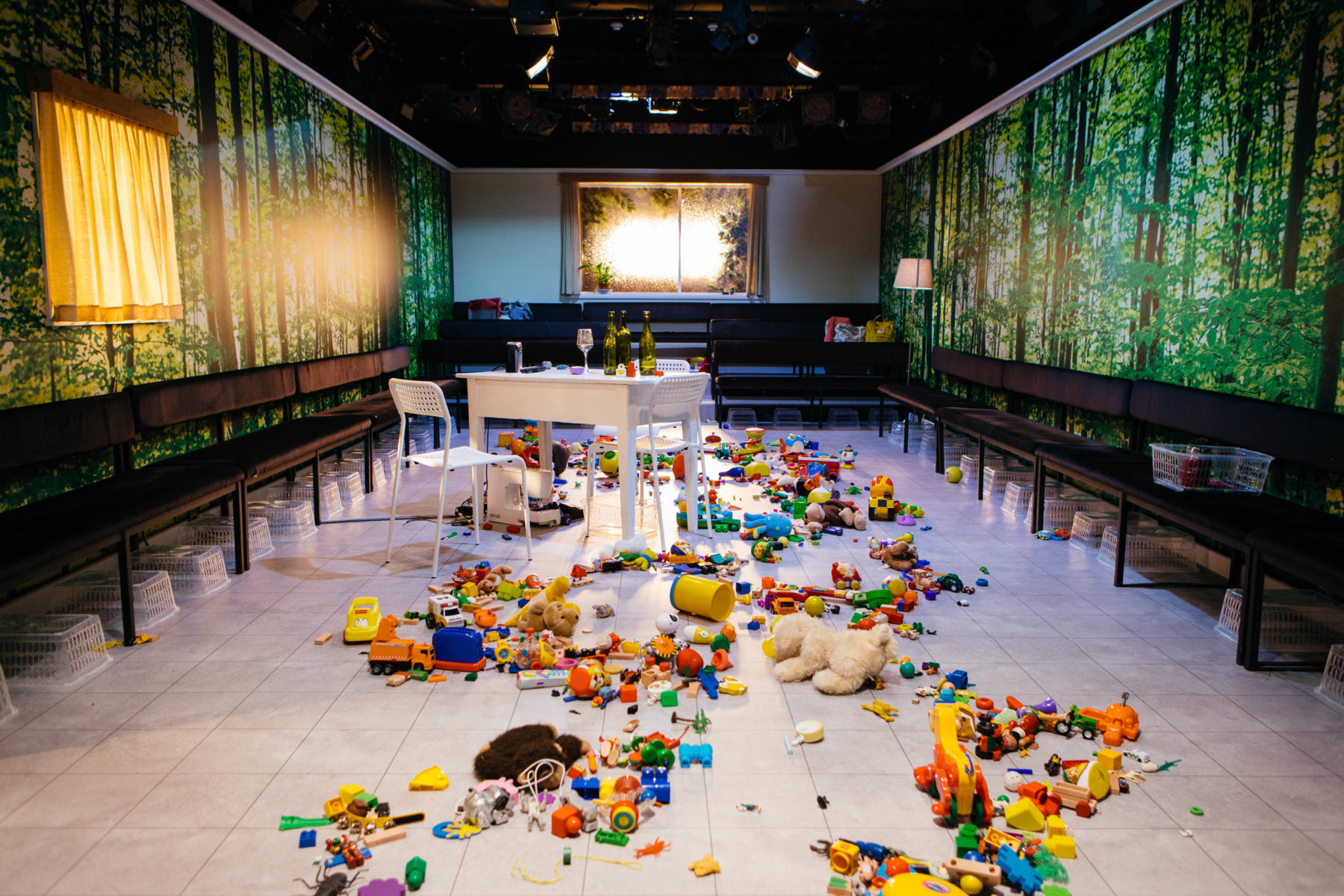 The floor is tiled linoleum, there is a white table and some wine bottles, a door, two windows. Toys are everywhere, to the point that actors and audience can’t move easily. The room is lined with a forest printed wallpaper. The real space (the kitchen) meets Suzy’s mental place: trying to find refuge in the wilderness but grounded to earth by her tragic reality.Throughout the play and with the help of the audience, the space will get cleaned, like Suzy’s mind, so she can rest and confront what she has done.