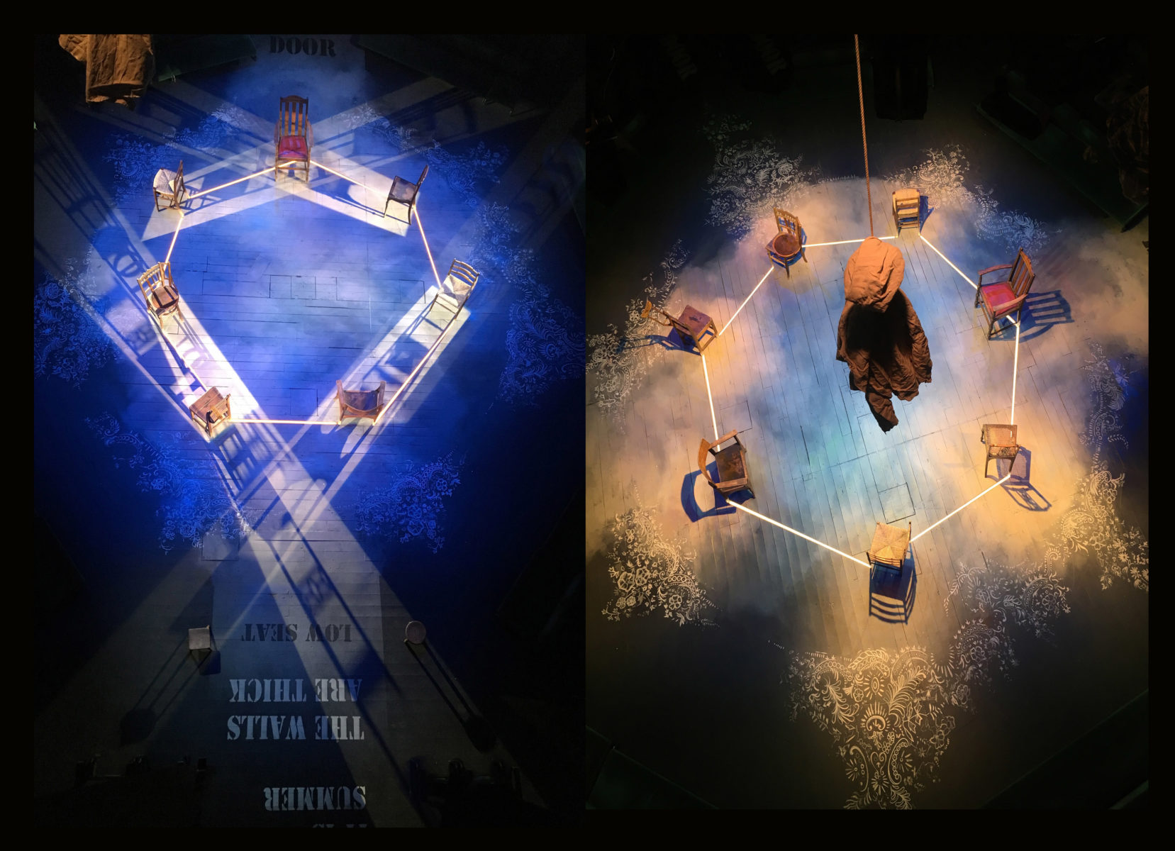 I initiated the idea/concept of rooting a chair for each family member of the Bernarda Alba household into the floor. Above each chair was a rope-bound piece of sackcloth. I used Lorca’s stage directions as printed text on the set, so that in terms of visual interpretation and imagination as audience members, we were all made equal.